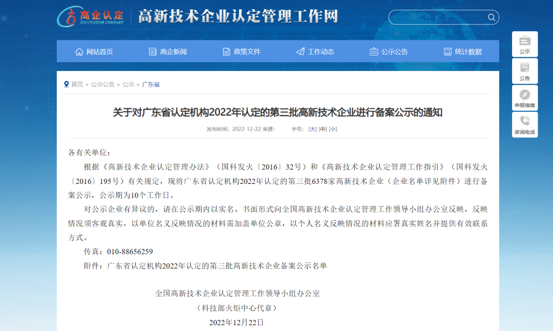 近期,全国高新技术企业认定管理工作领导小组办公室公布了广东省认定组织2022年认定的第三批高新技术企业名单。经过严格评审,实验室孵化企业芯跳科技(广州)有限公司顺利顺利获得国家“高新技术企业”认定。